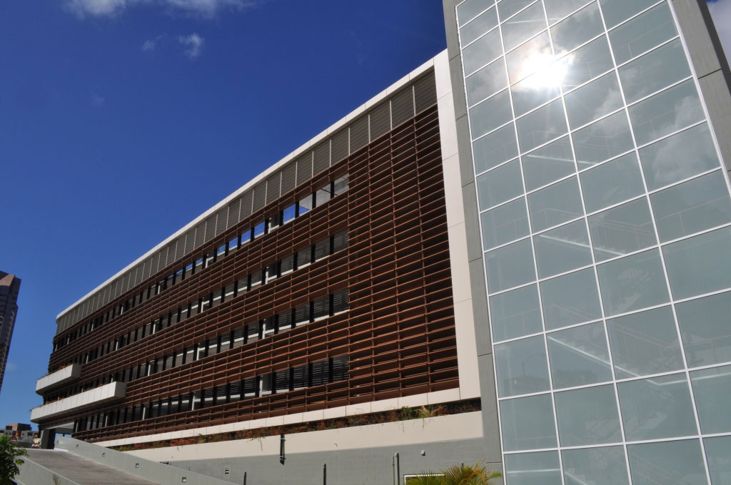 Project goals called for aesthetically pleasing exterior facades and hard/landscaping much of which was in the planning as the core structure’s cast-in-place concrete walls and floors were being built. The goal to render an all-concrete structure meeting the aesthetic standards for the State Capitol’s Special Design district was achieved through the extensive use of glass paneling and louvered facades. Hawaiian Dredging fabricated a striking and impressive “Hawaiian” motif for the vertical concrete walls enclosing the stairwell and elevator shaft, a solid example of the design-build capability the company brings to all of its projects. The building received a LEED Gold rating for which Hawaiian Dredging provided all of the documentation but what was most important to the company was the rating from the City’s projects manager of “outstanding!”