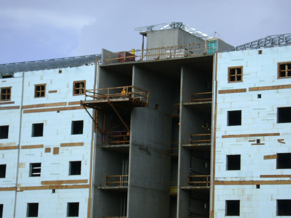 Tunnel forming was used for the construction of the main building which also included insulated concrete foam on the exterior among other design elements to meet LEED Silver certification standards.
